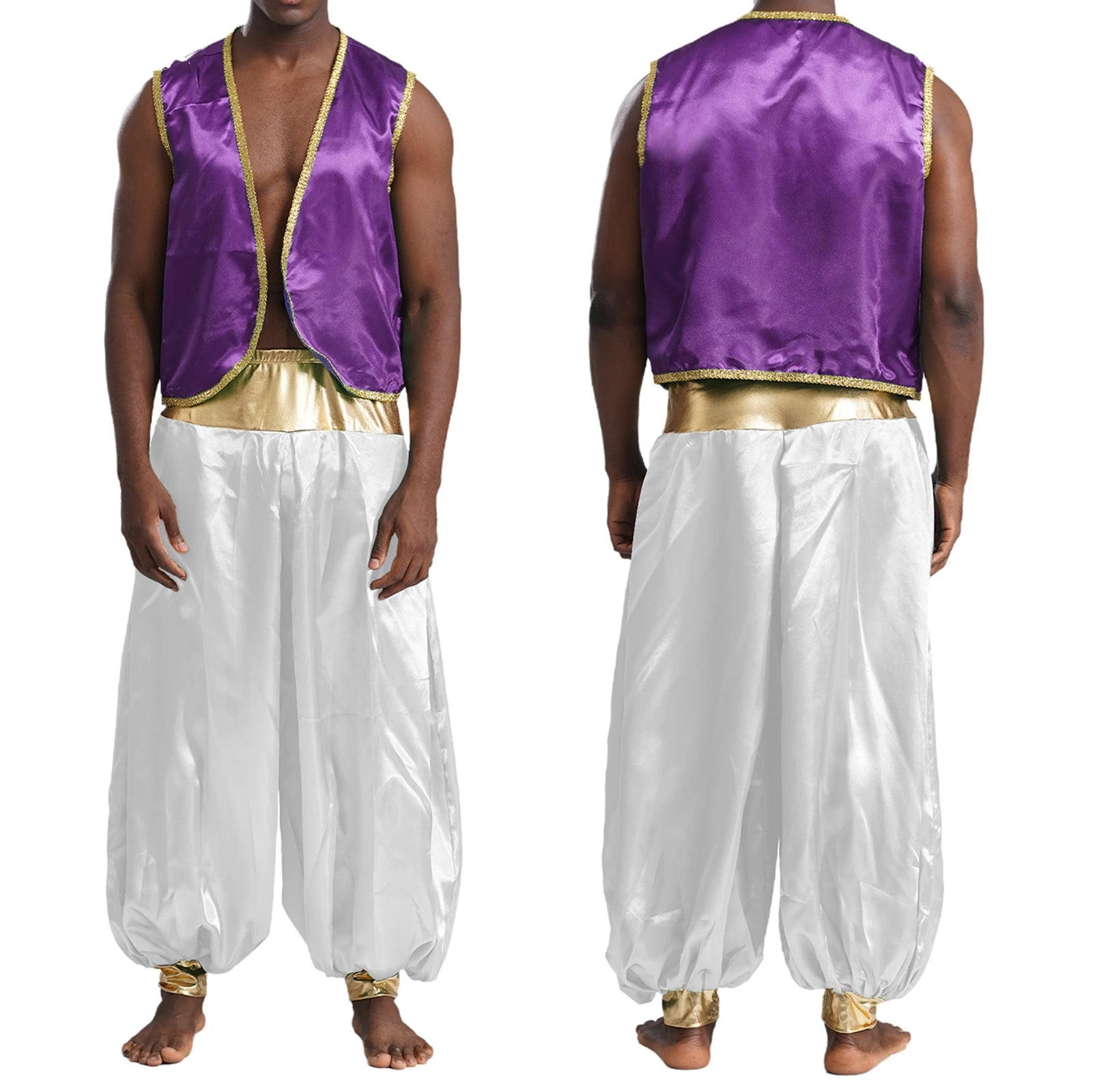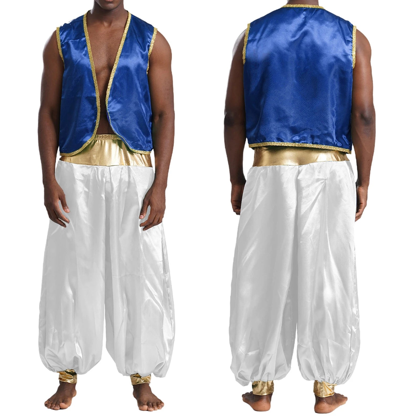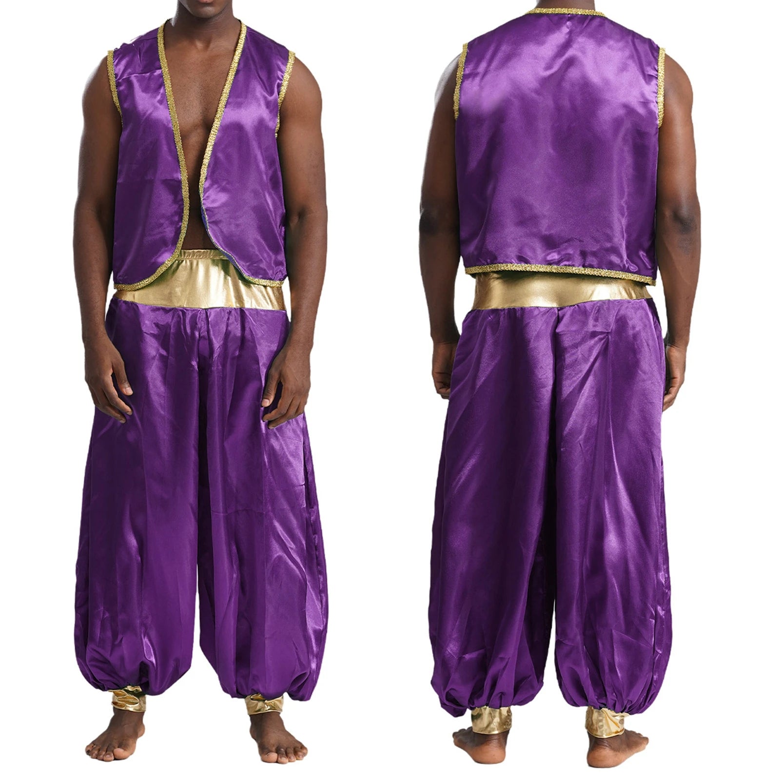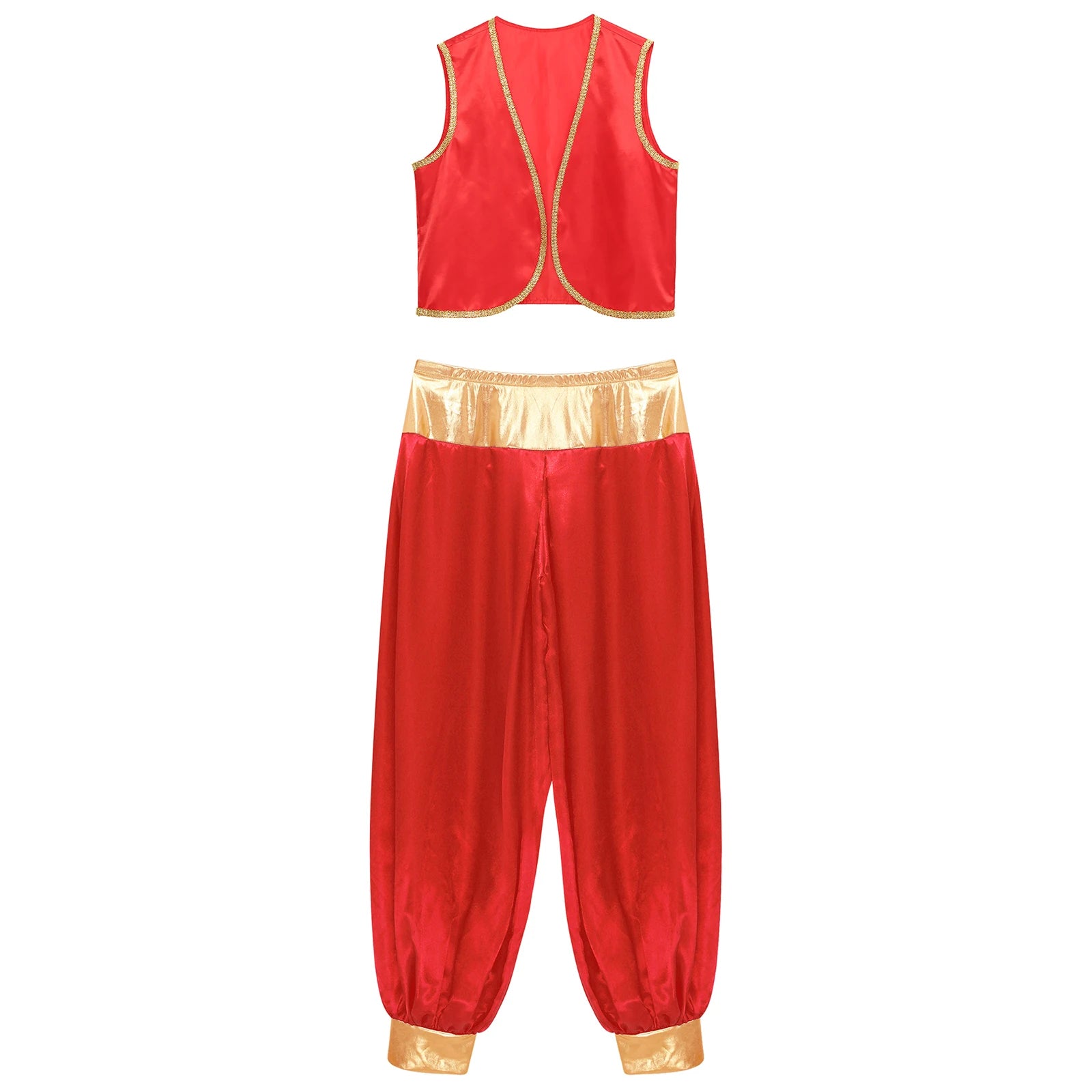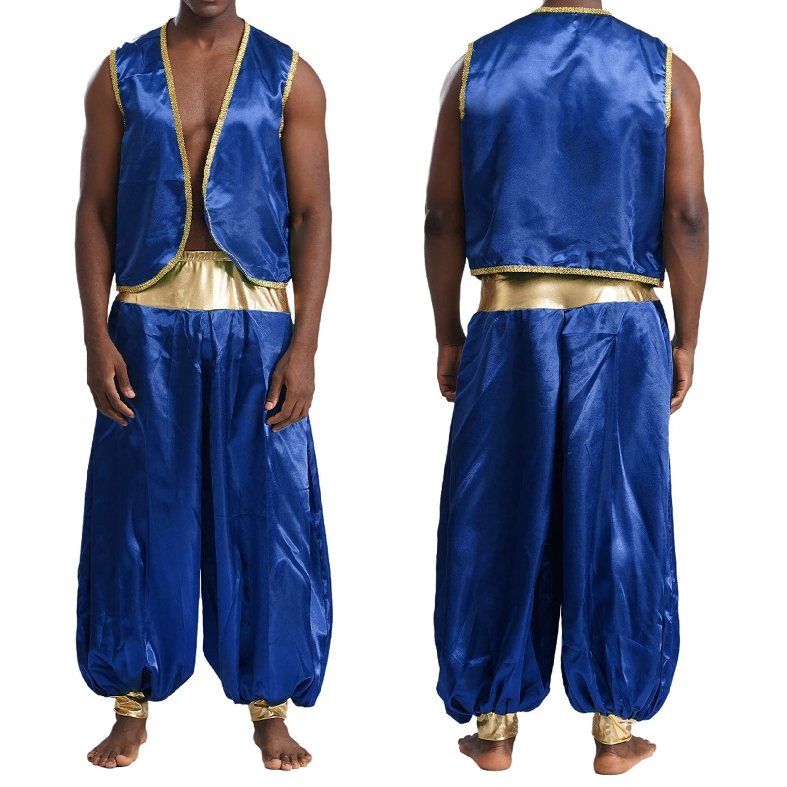 Dit kostuum bestaat uit een vest en een bijpassende broek en is gemaakt van een comfortabele satijnmix die zacht aanvoelt op de huid. Het vest heeft een open voorkant, een sierlijke afgeronde zoom en decoratieve goudkleurige afwerking, wat zorgt voor een verfijnde en opvallende look. De broek is ontworpen in haremstijl en heeft een elastische tailleband met ritssluiting aan de zijkant, waardoor deze prettig draagt en eenvoudig aan te trekken is.