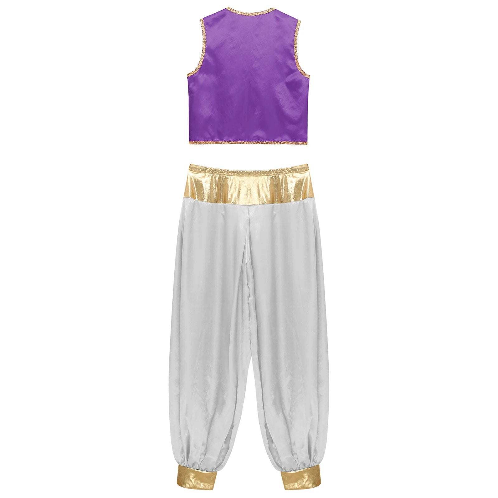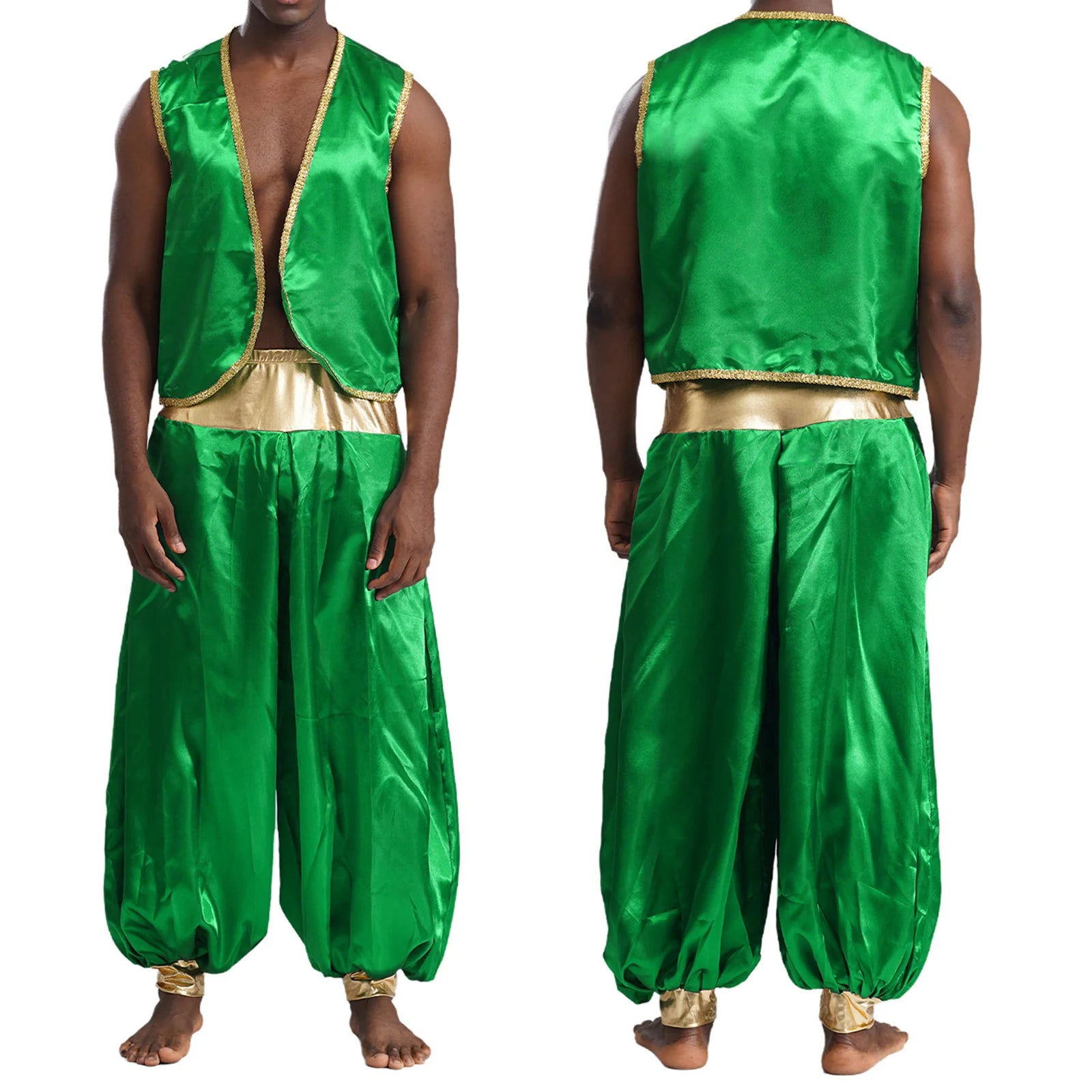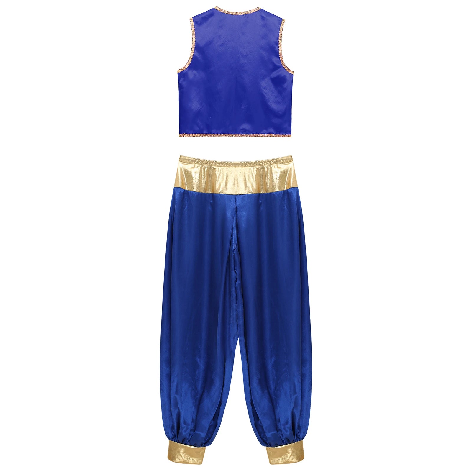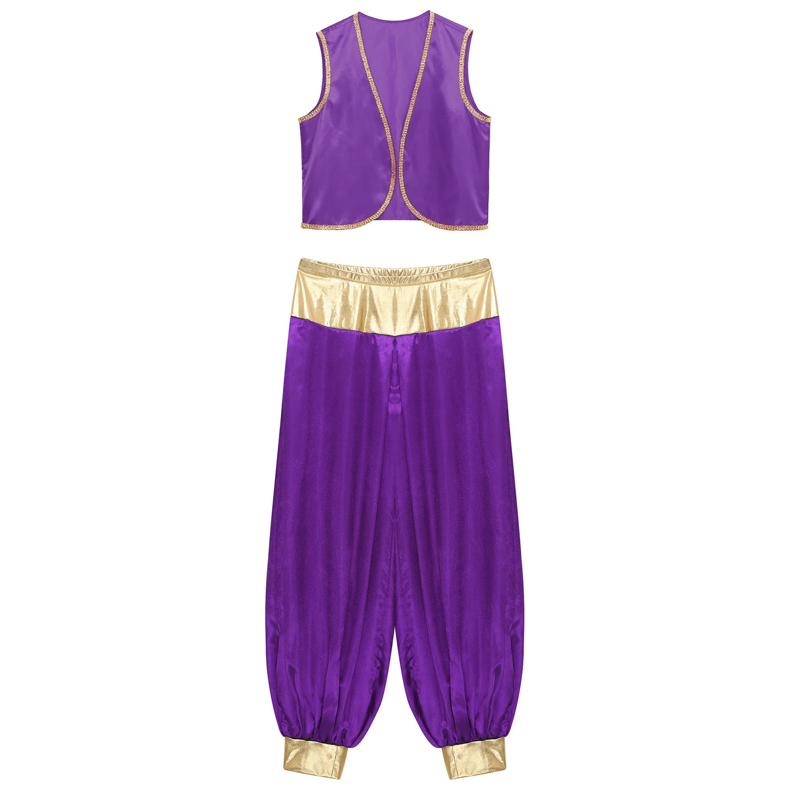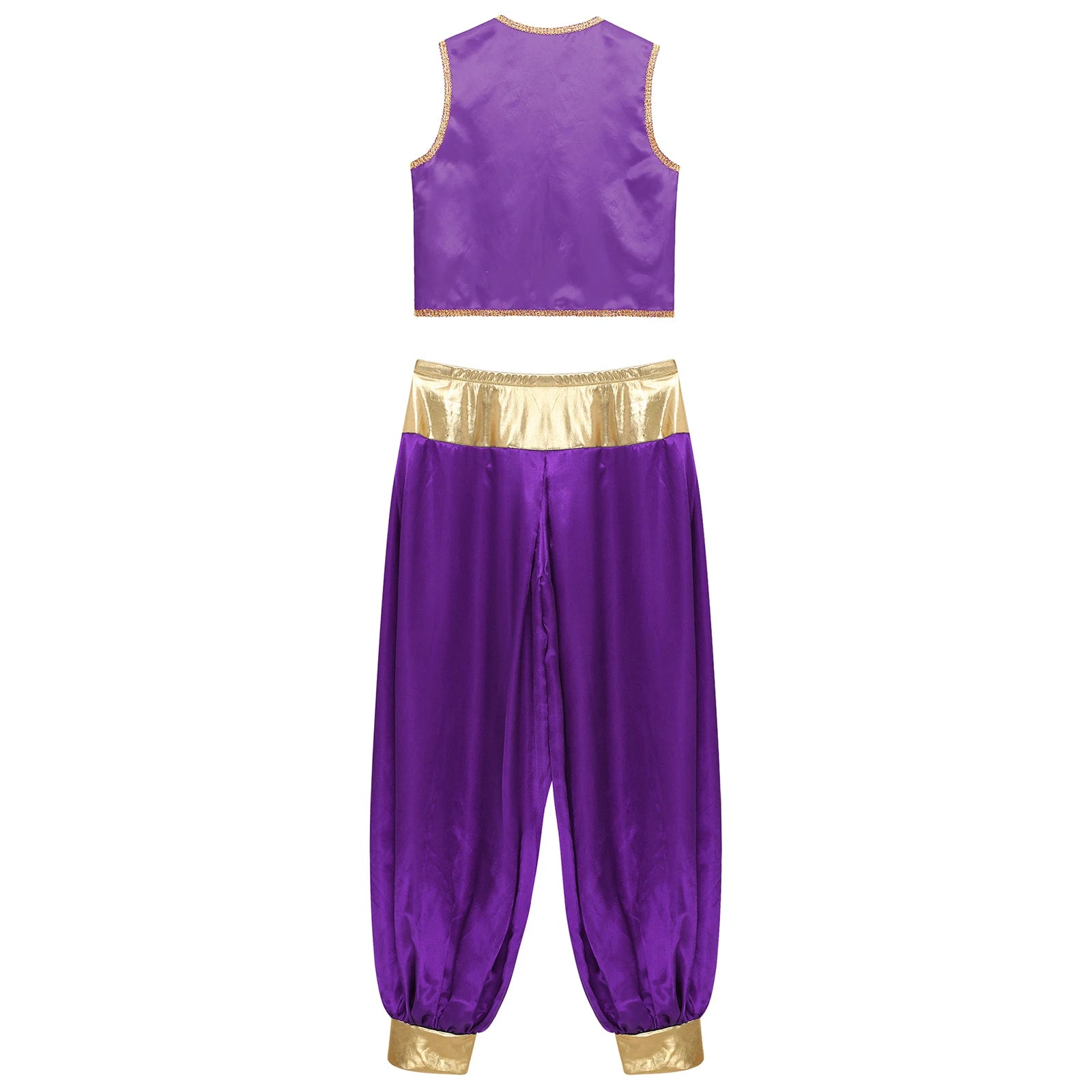 Dit kostuum bestaat uit een vest en een bijpassende broek en is gemaakt van een comfortabele satijnmix die zacht aanvoelt op de huid. Het vest heeft een open voorkant, een sierlijke afgeronde zoom en decoratieve goudkleurige afwerking, wat zorgt voor een verfijnde en opvallende look. De broek is ontworpen in haremstijl en heeft een elastische tailleband met ritssluiting aan de zijkant, waardoor deze prettig draagt en eenvoudig aan te trekken is.