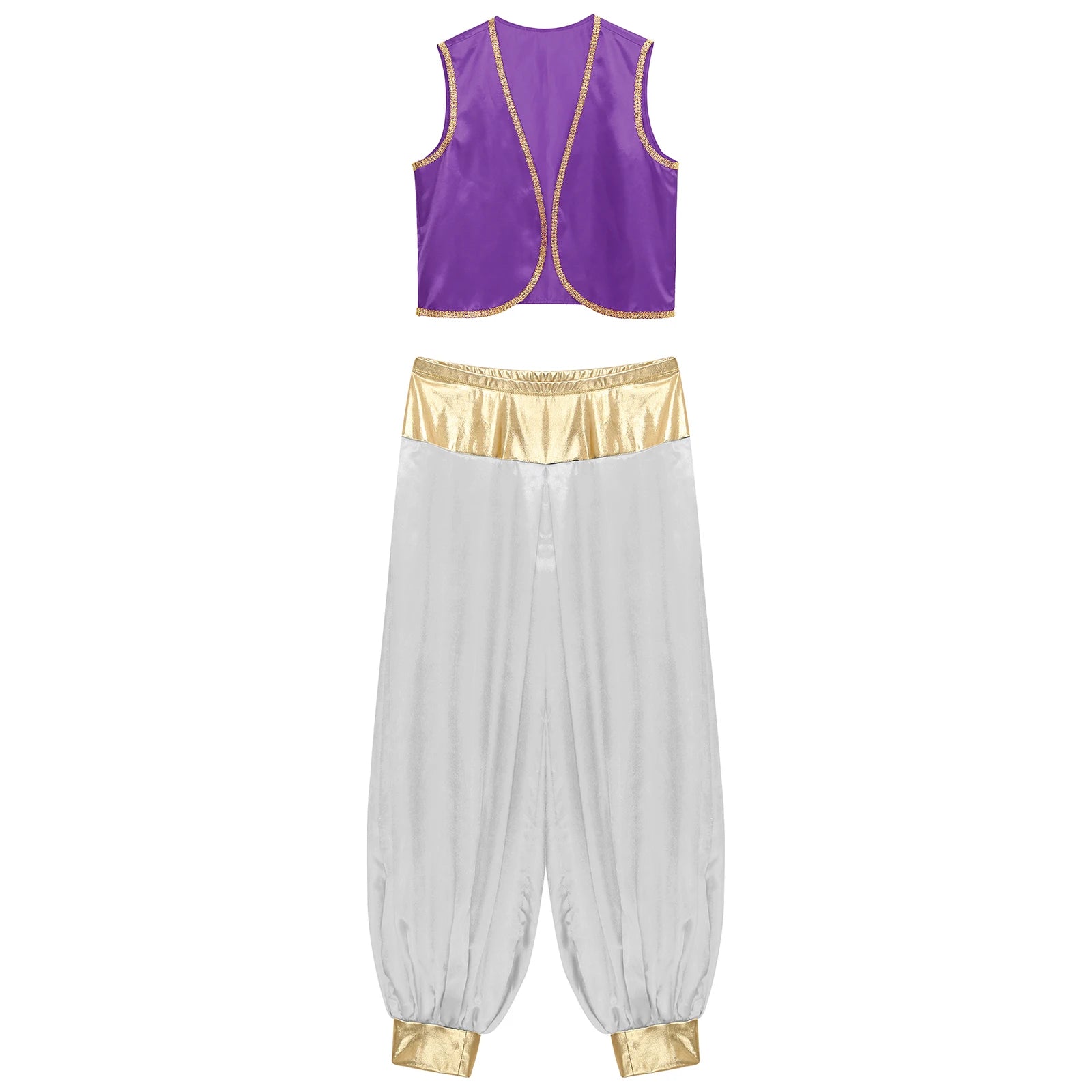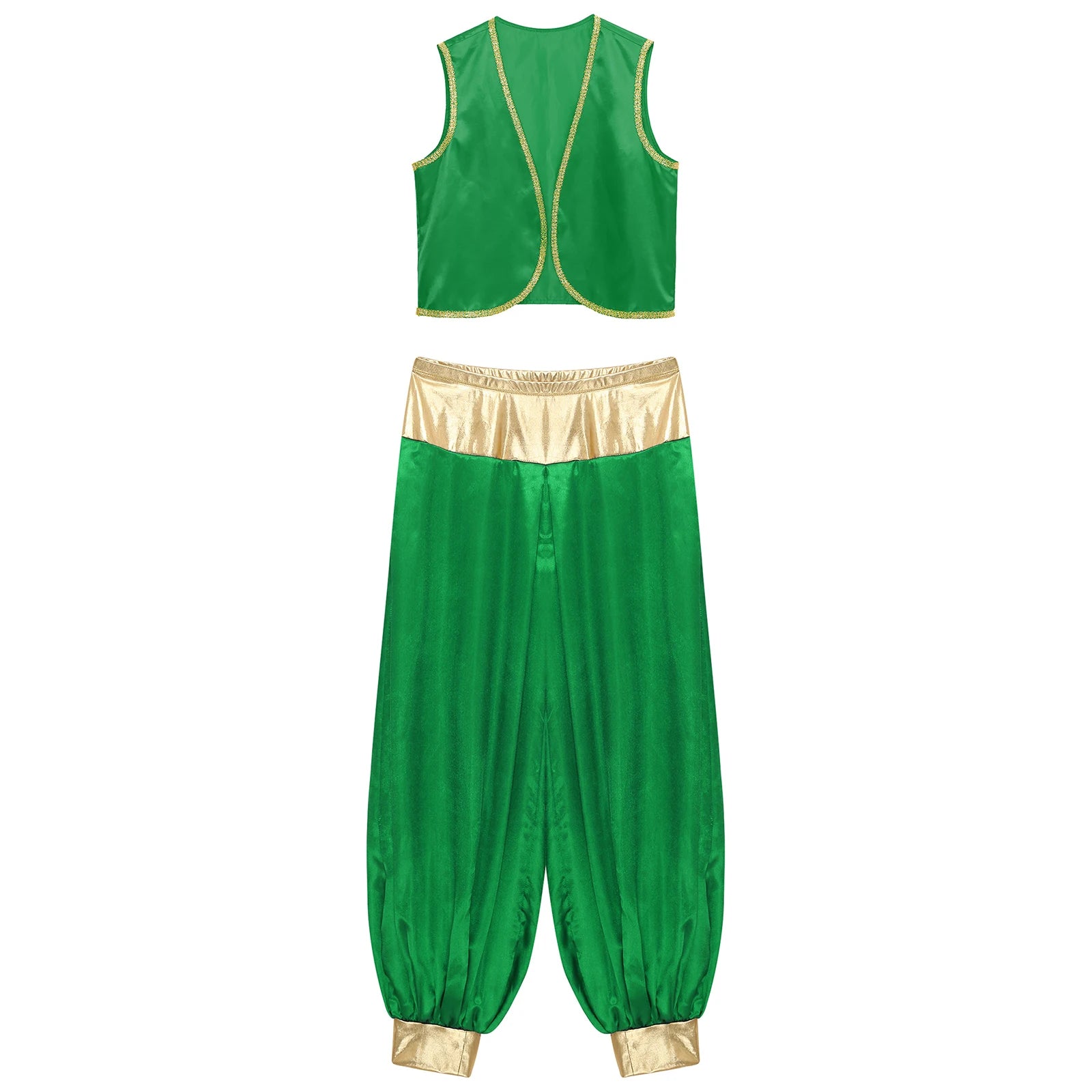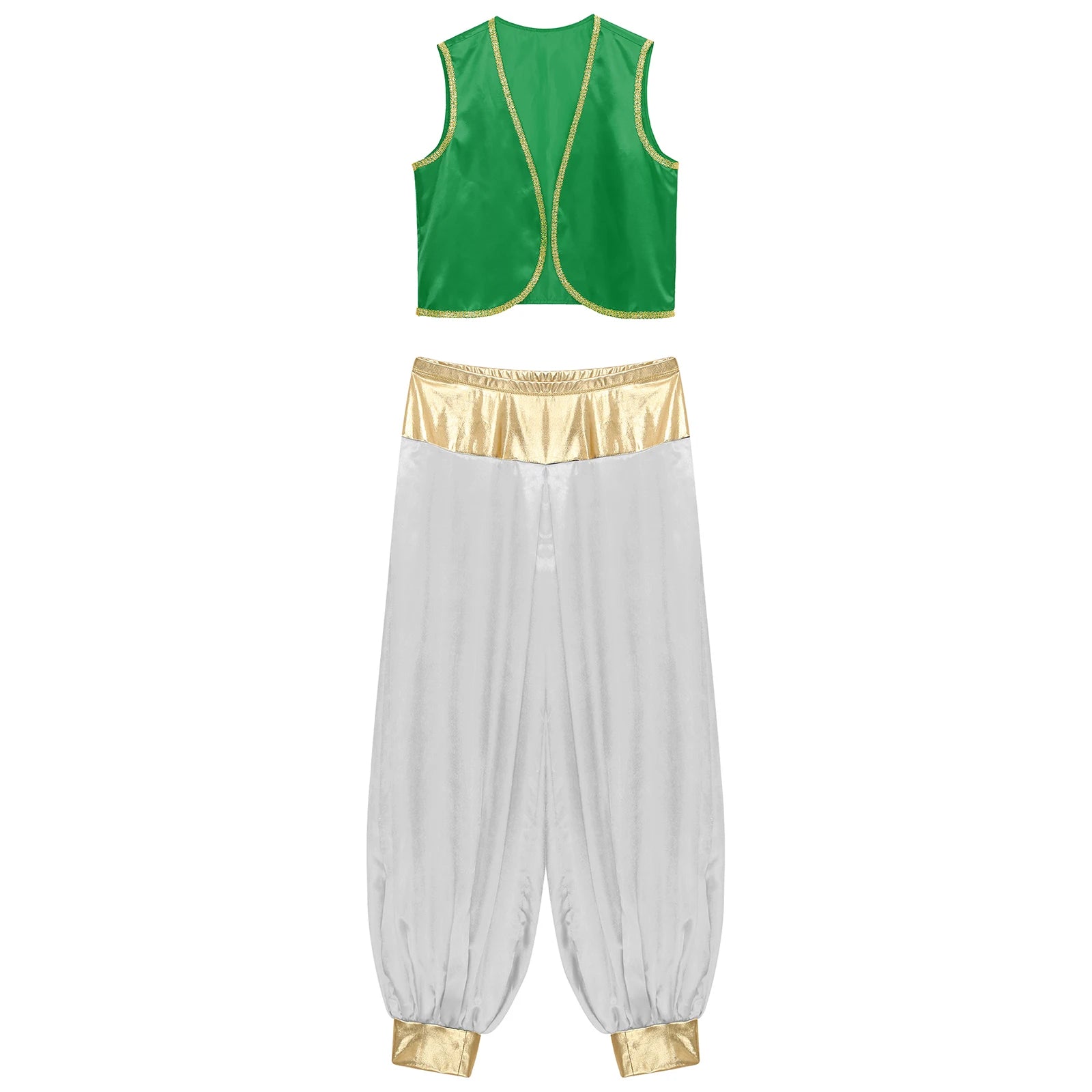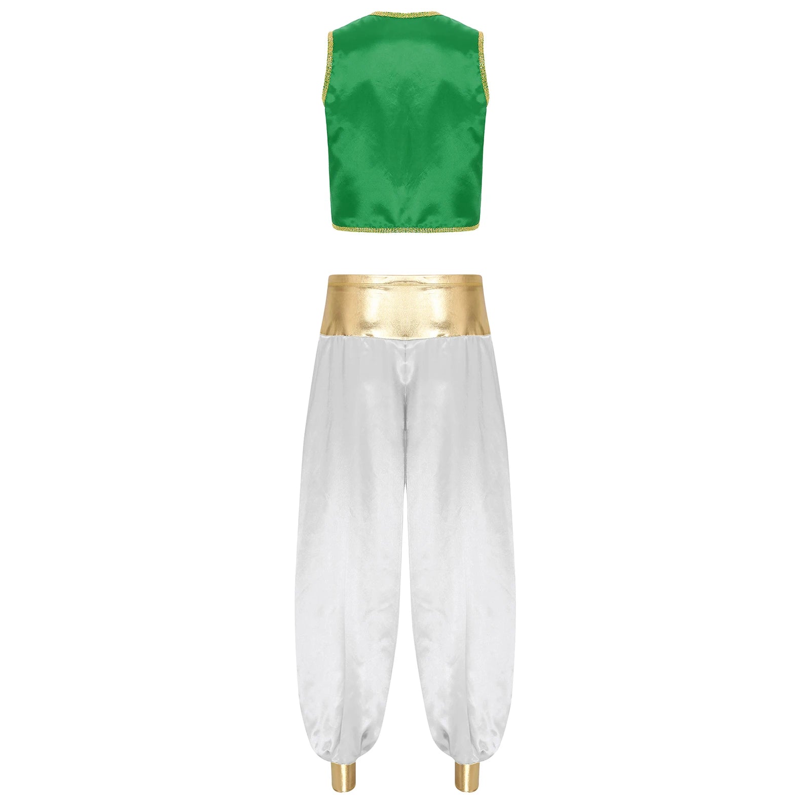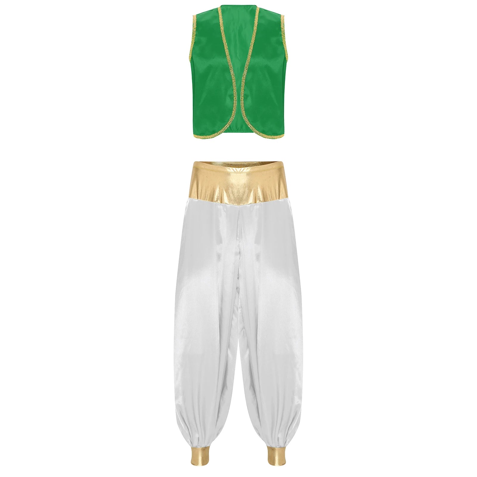 Dit kostuum bestaat uit een vest en een bijpassende broek en is gemaakt van een comfortabele satijnmix die zacht aanvoelt op de huid. Het vest heeft een open voorkant, een sierlijke afgeronde zoom en decoratieve goudkleurige afwerking, wat zorgt voor een verfijnde en opvallende look. De broek is ontworpen in haremstijl en heeft een elastische tailleband met ritssluiting aan de zijkant, waardoor deze prettig draagt en eenvoudig aan te trekken is.