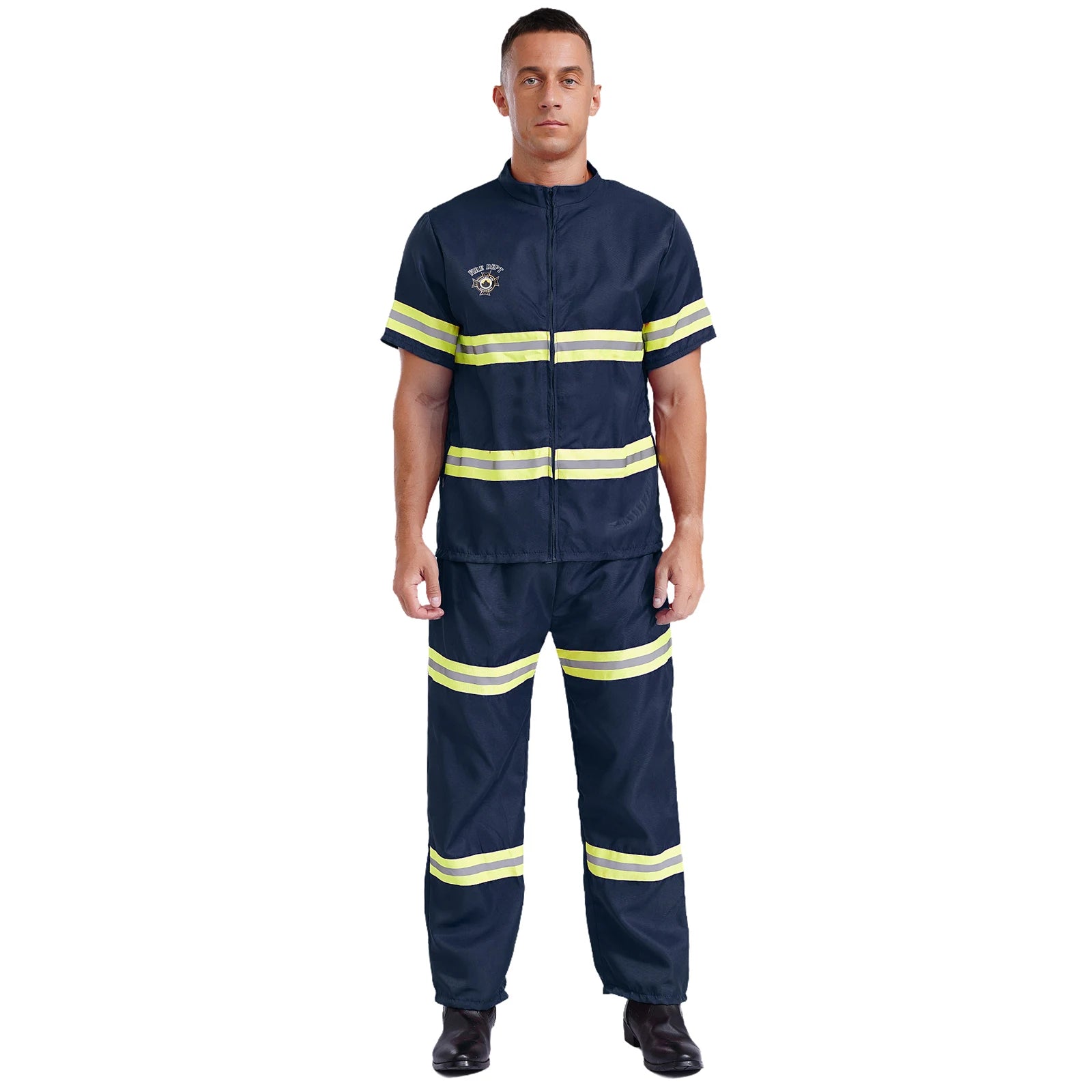 Het kostuum bestaat uit een jas met ritssluiting, een bijpassende broek met elastische taille, een verstelbare riem en een plastic helm. De materialen voelen prettig aan op de huid en zijn geschikt om langere tijd te dragen. Reflecterende details zorgen voor extra zichtbaarheid en versterken de authentieke look.