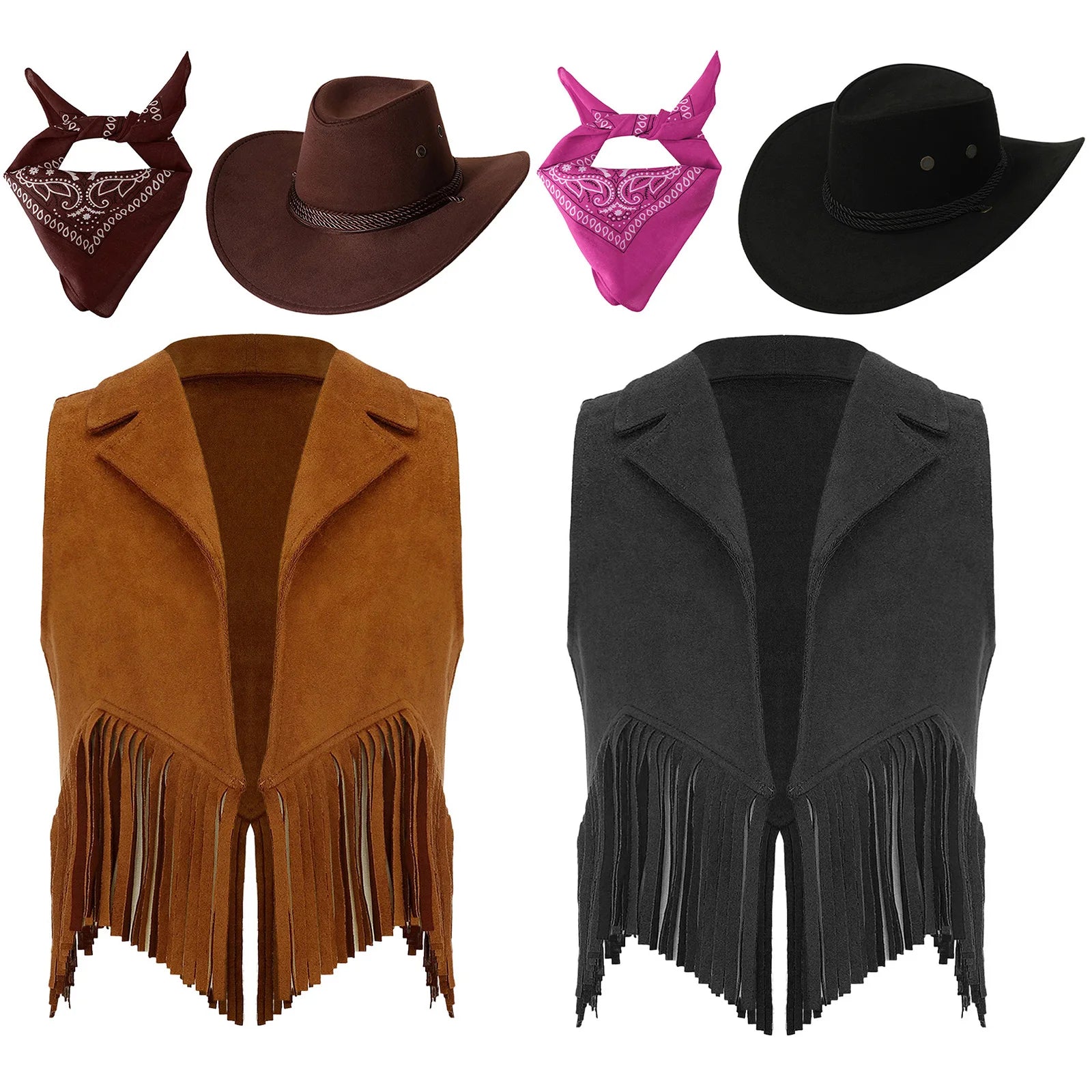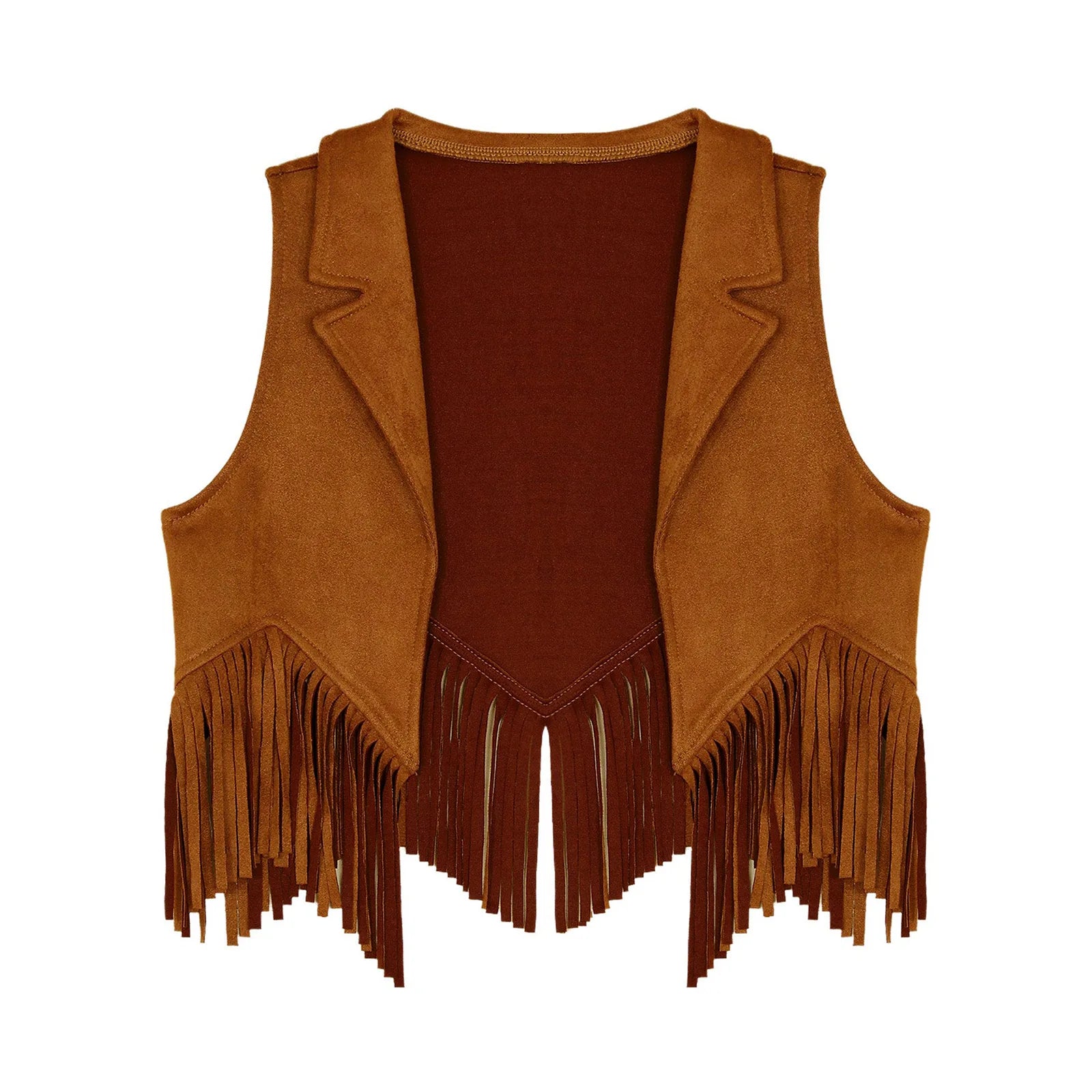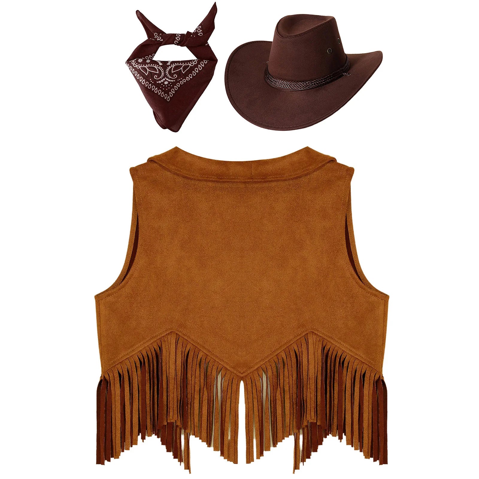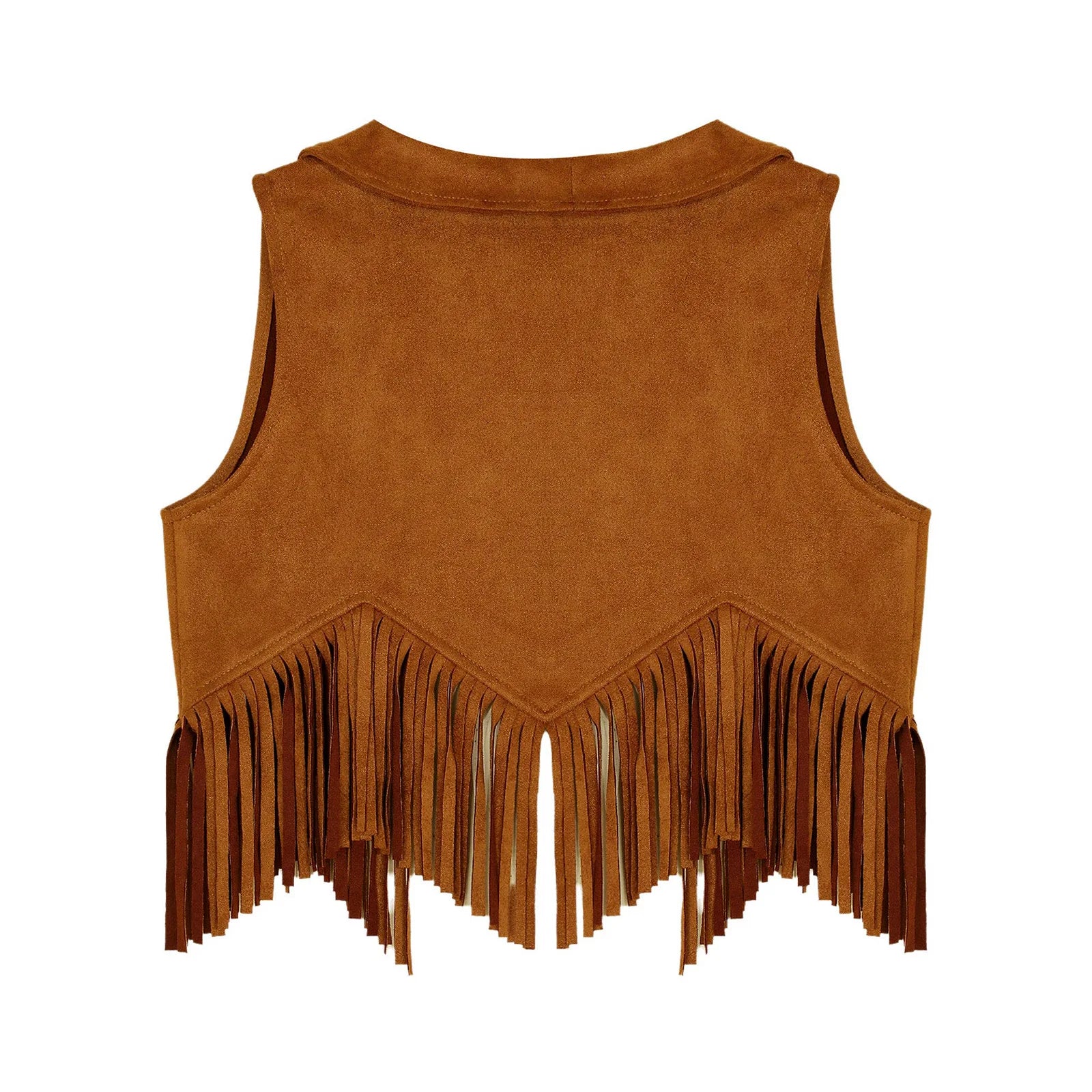 Het vest is uitgevoerd in een zachte, lichte stof met een suède-achtige uitstraling en een open voorkant, wat zorgt voor een nonchalante en authentieke cowgirl look. De franjes geven extra beweging en karakter, ideaal voor dansen en feestvieren. De hoed sluit hier mooi op aan en versterkt het western thema, terwijl de bandana een speels accent toevoegt.