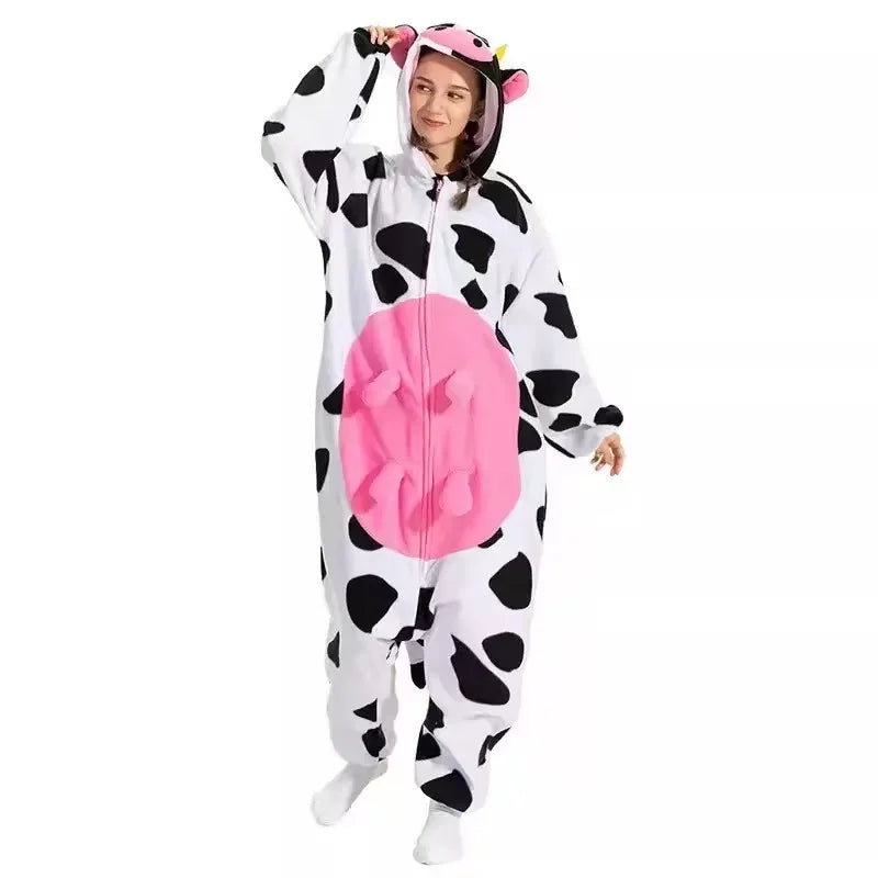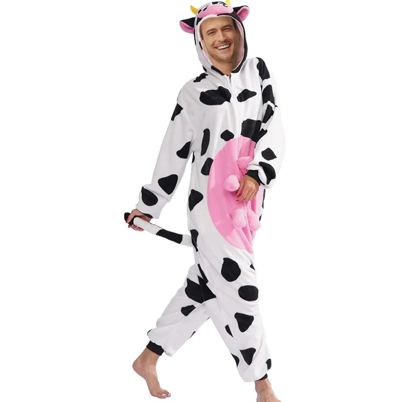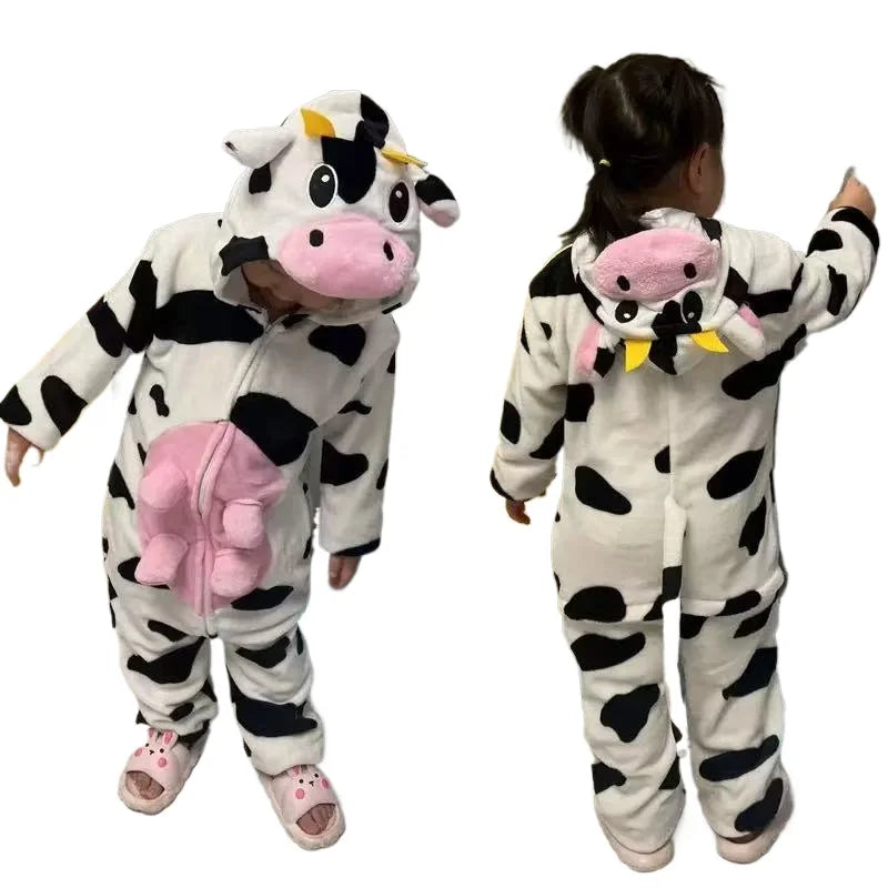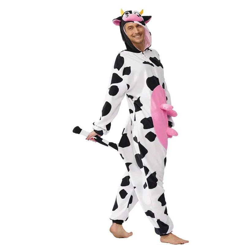 Dit kostuum is uitgevoerd als een zachte one-piece jumpsuit en is ontworpen om warmte en comfort te bieden. Het flanellen materiaal voelt aangenaam aan op de huid en maakt het kostuum ideaal voor koudere dagen en avonden. De cartoonachtige koeienlook zorgt voor een grappige en herkenbare uitstraling.