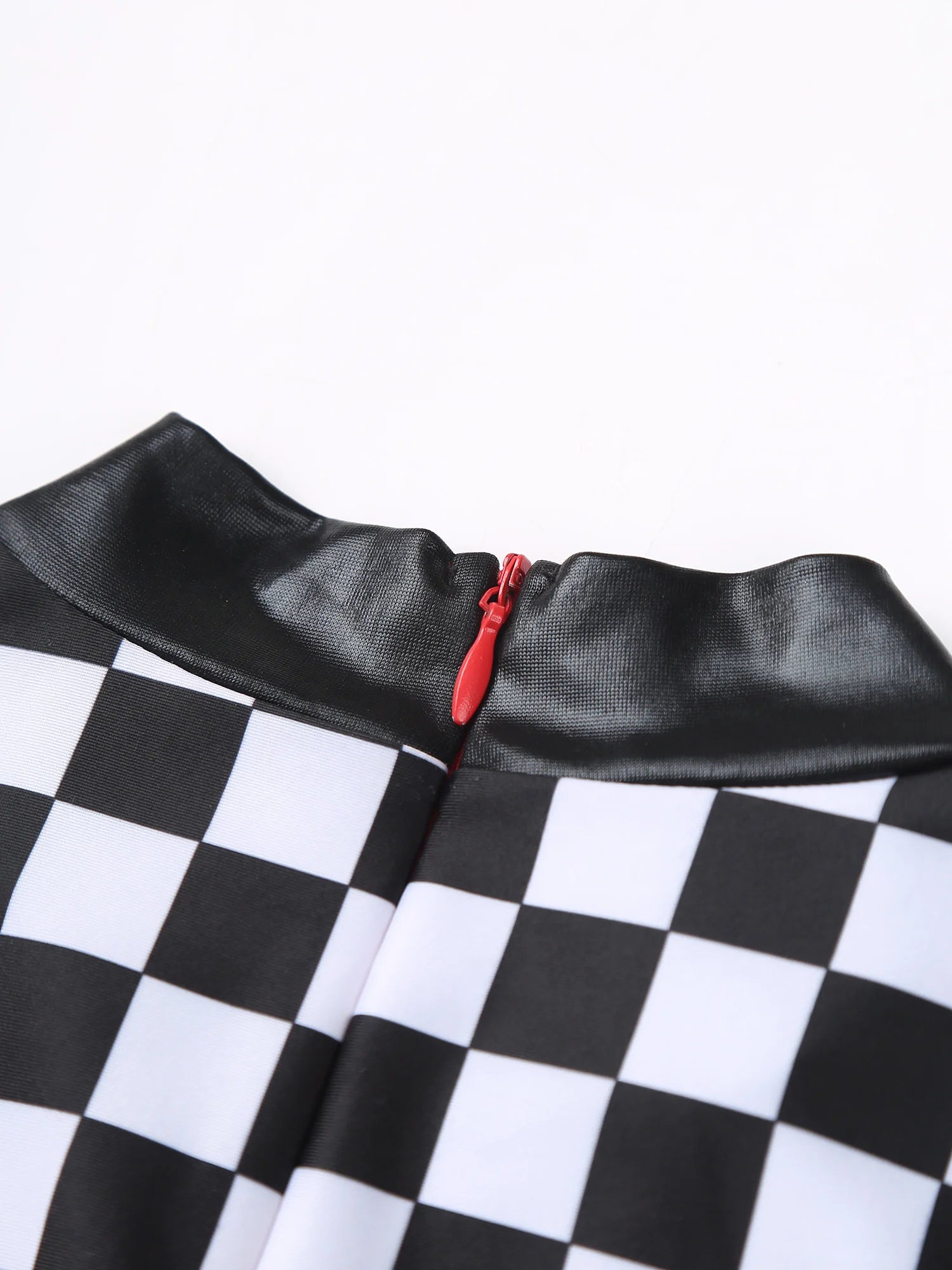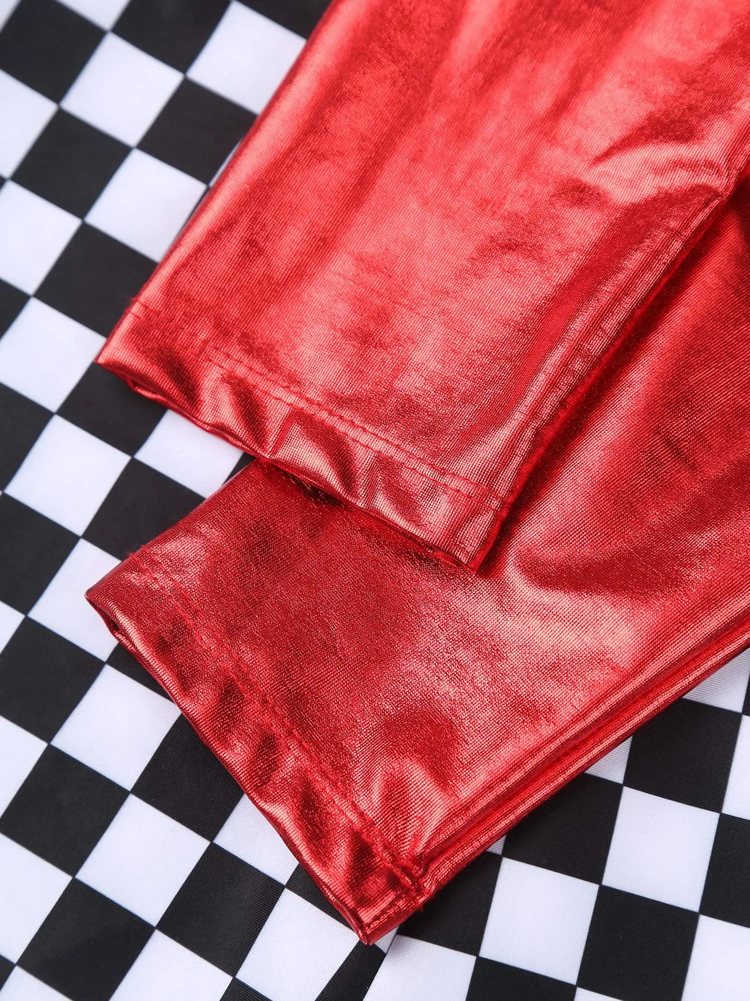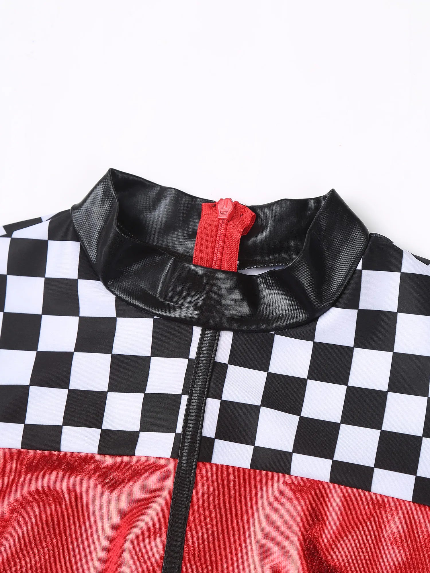 Het kostuum bestaat uit een eendelige jumpsuit met lange mouwen en korte broekspijpen. De jumpsuit is gemaakt van polyester met PU-leer en spandex en is afgewerkt met een non-woven weeftechniek. Het model heeft een aangesloten pasvorm en een ritssluiting aan de achterkant. Het ontwerp is geïnspireerd op race- en coureurstijlen en is bedoeld als verkleedkleding voor carnaval of andere feestelijke gelegenheden.