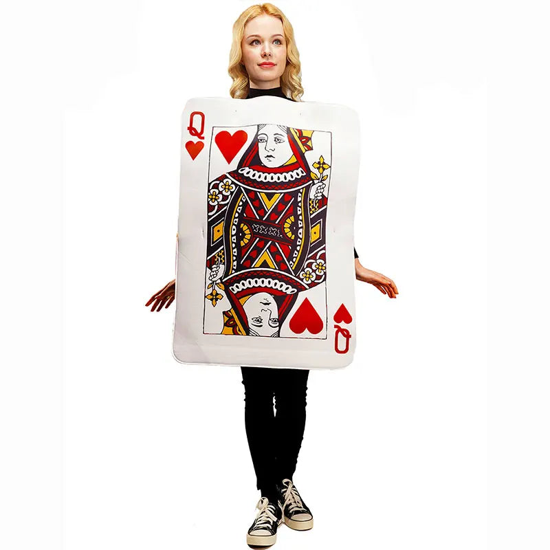 Het kostuum is gemaakt van polyester en uitgevoerd als een complete set in tuniekvorm. Het ontwerp is gebaseerd op speelkaartfiguren en kan gedragen worden als Queen of Hearts, King of Hearts of Club K. Dankzij de eenvoudige constructie trek je het kostuum gemakkelijk aan en zit het comfortabel tijdens het dragen.