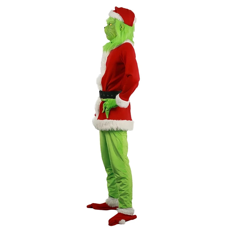 Dit kostuum bestaat uit een complete set met een top, broek, riem en een bijpassend masker. Het ontwerp is geïnspireerd op het bekende groene kerstpersonage en zorgt voor een authentieke en opvallende uitstraling. Het kostuum is gemaakt van polyester, terwijl het masker is vervaardigd uit latex voor een realistische look.