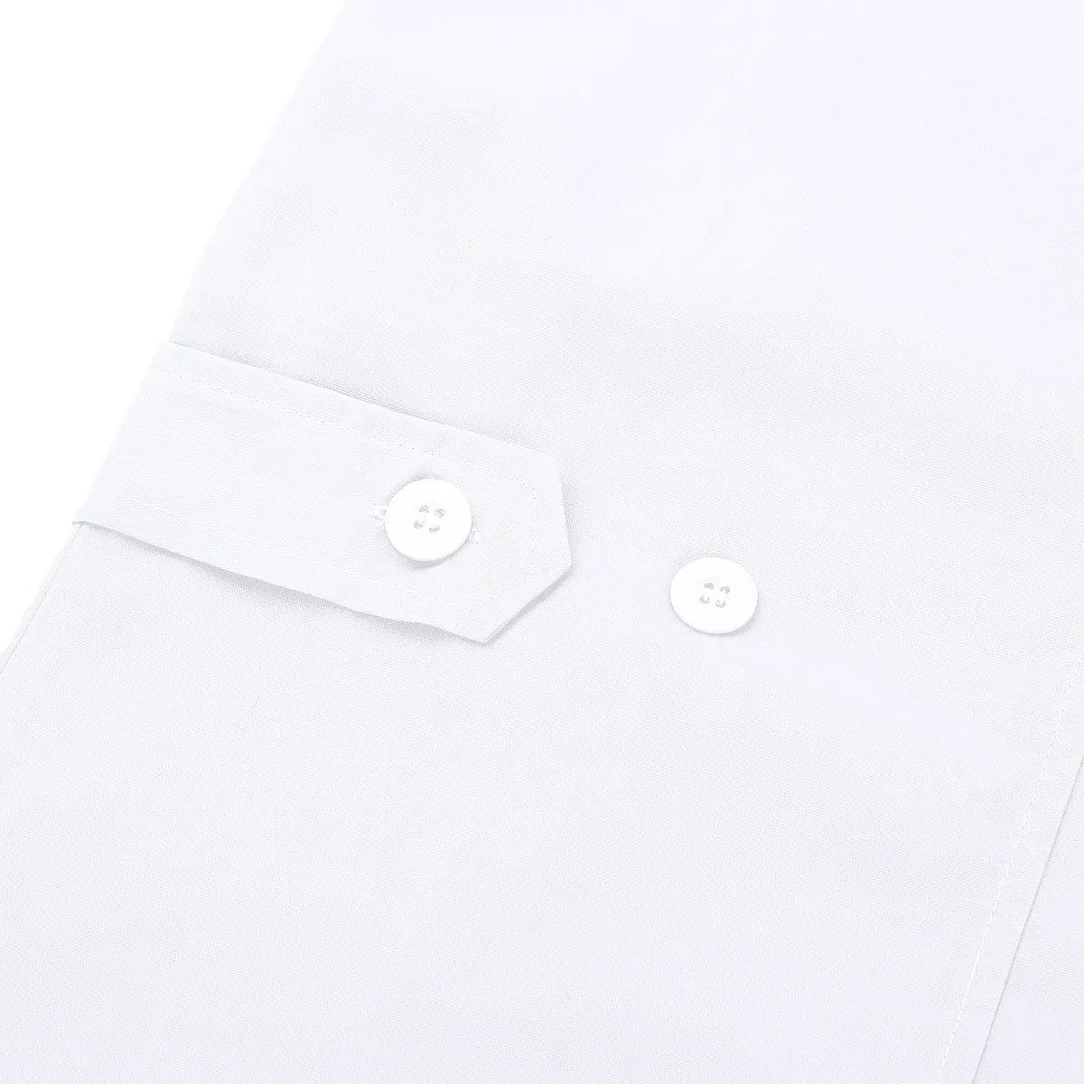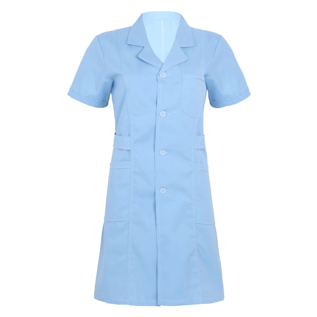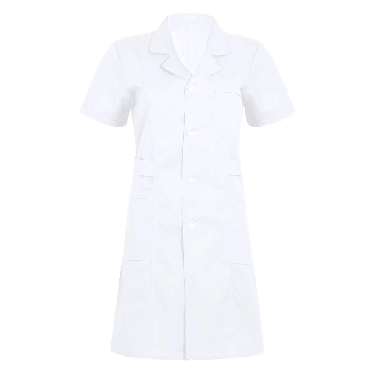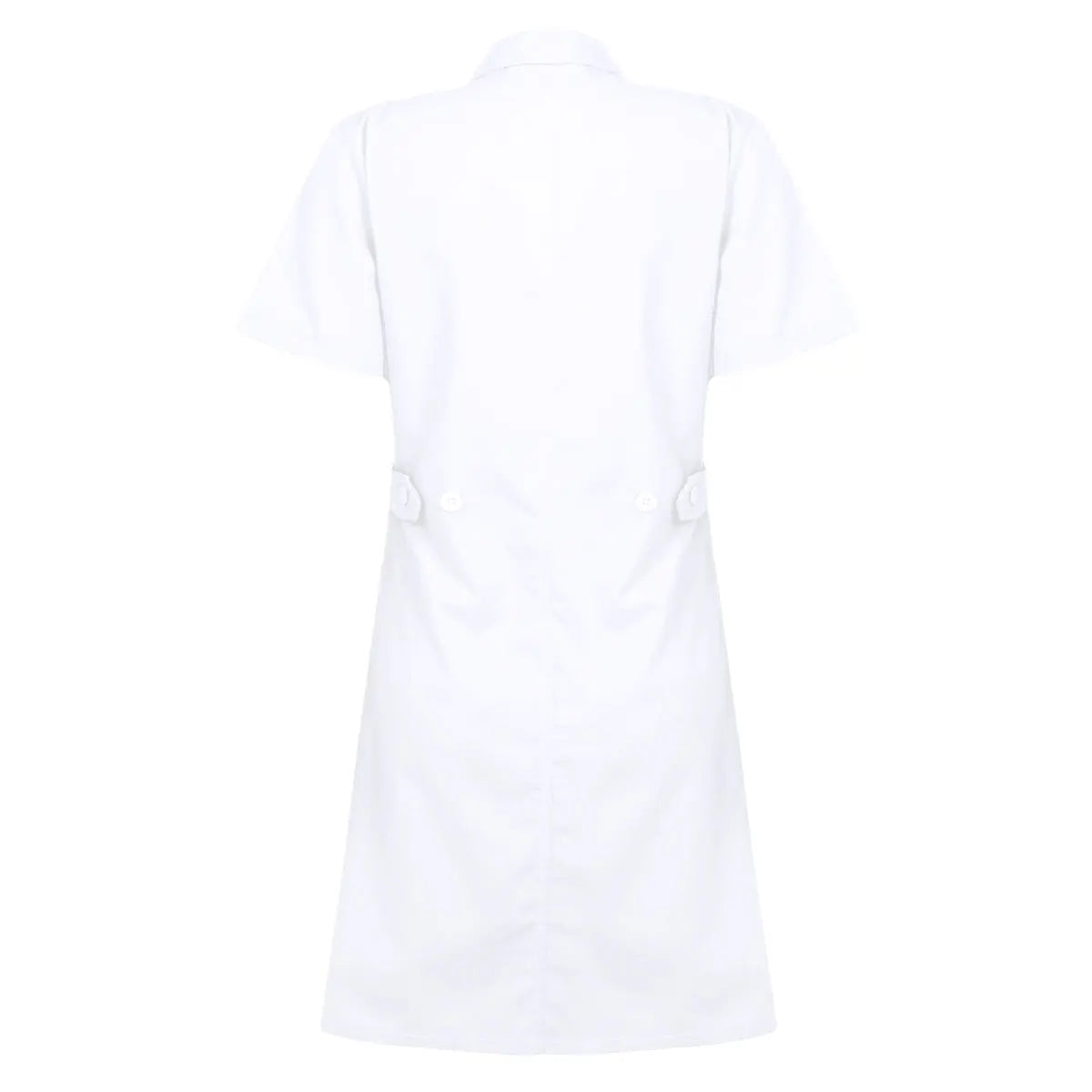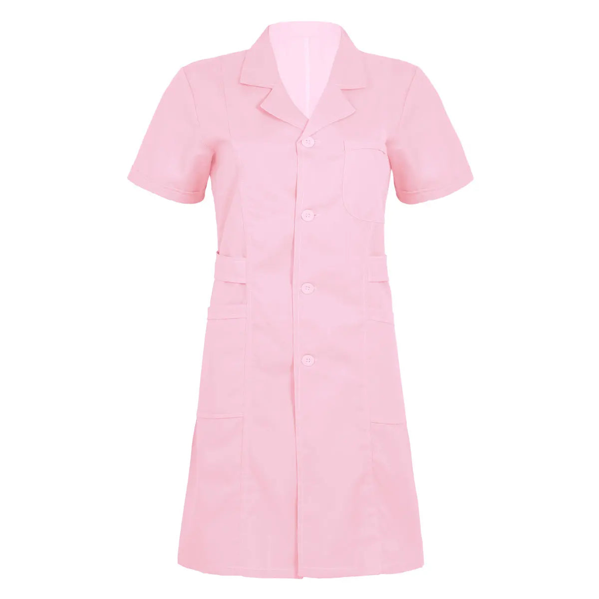 Deze verpleegster jas is ontworpen als een comfortabele jurkjas met korte mouwen en een klassieke kraag. De jas sluit aan de voorkant met knopen en is voorzien van meerdere praktische zakken aan de taille en borst. De pasvorm is licht getailleerd dankzij verstelbare knoopsluitingen aan de zijkanten, wat zorgt voor een nette en comfortabele uitstraling.